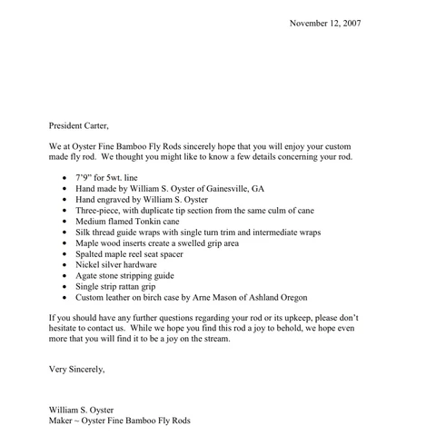 The letter from Oyster included with the first rod made for Carter.